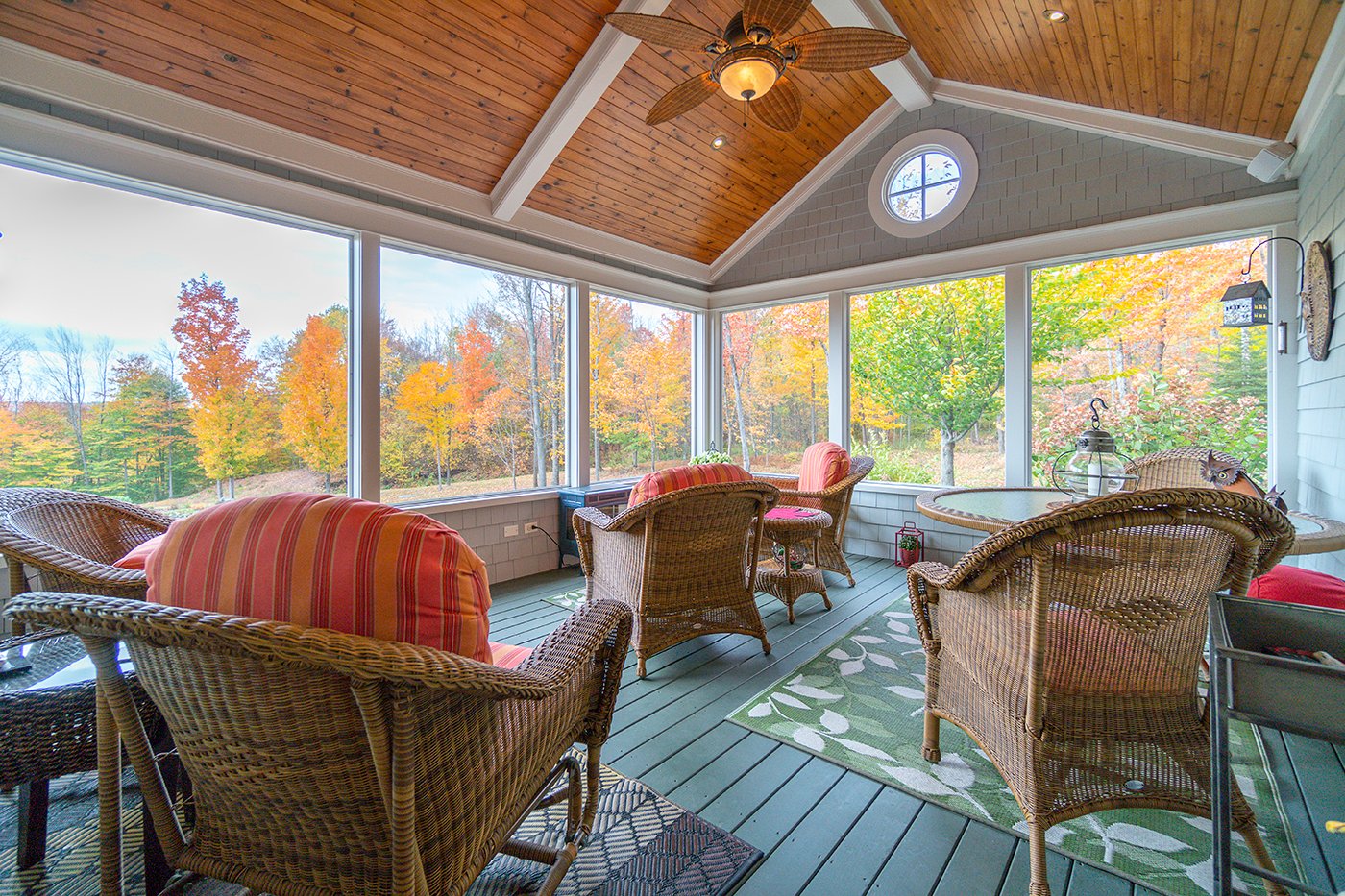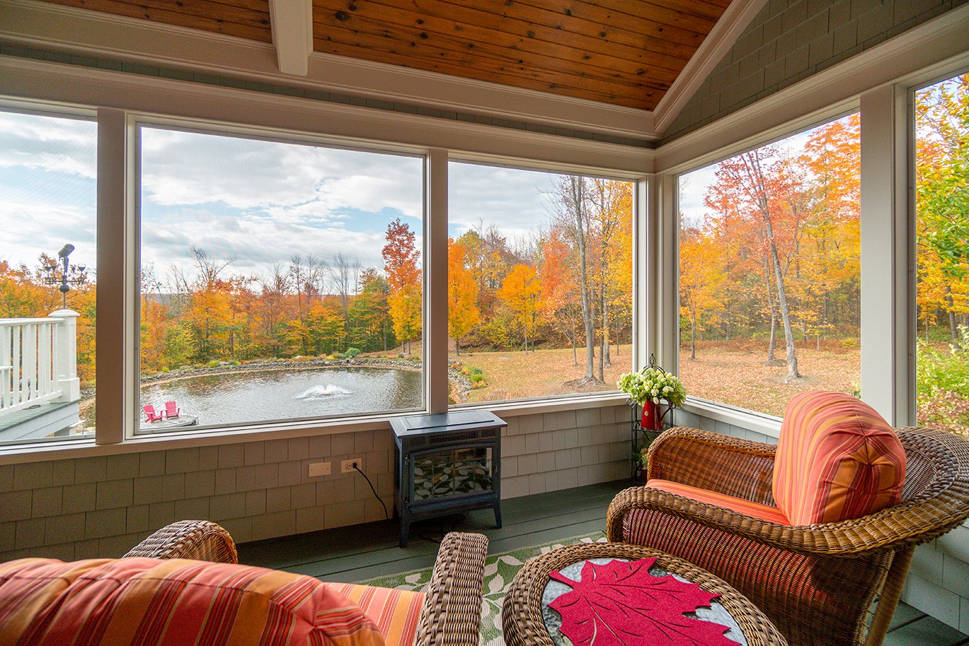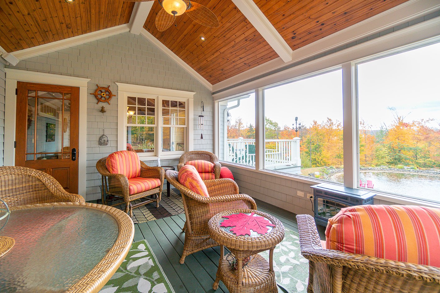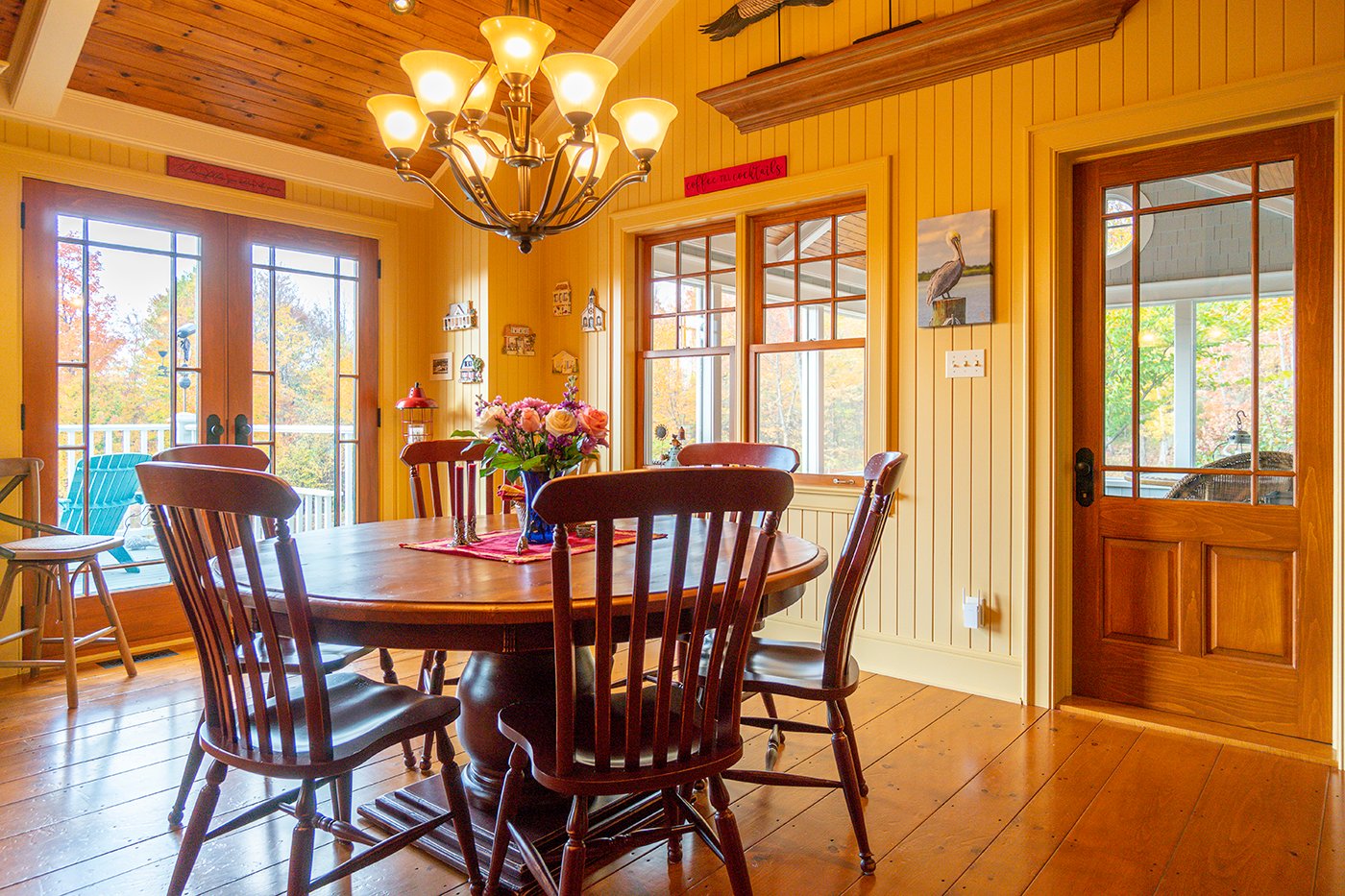 Une véranda accessible via la salle à manger offre une vue imprenable sur le lac bordant la cour arrière boisée.