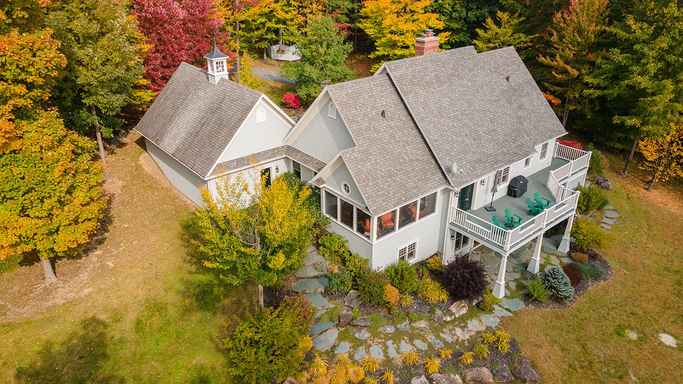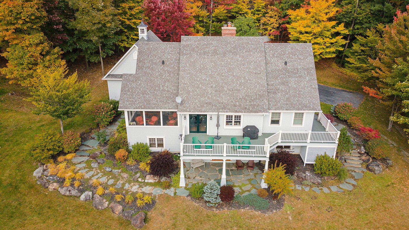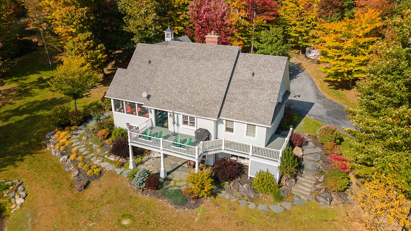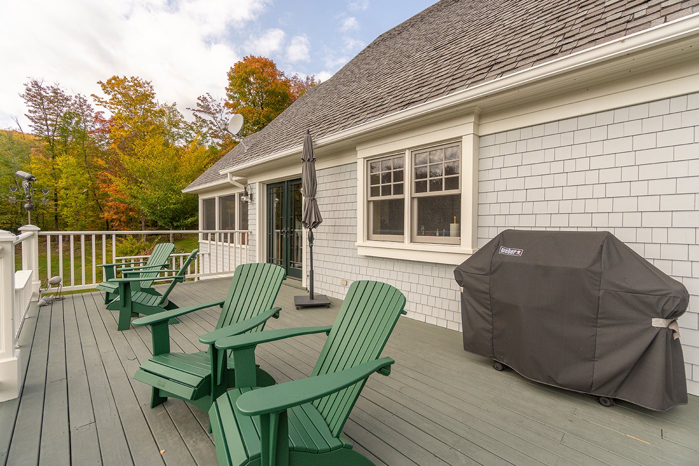 Une véranda accessible via la salle à manger offre une vue imprenable sur le lac bordant la cour arrière boisée.