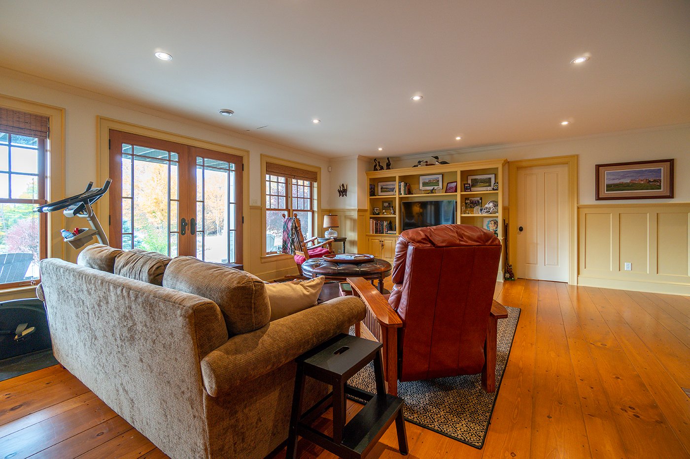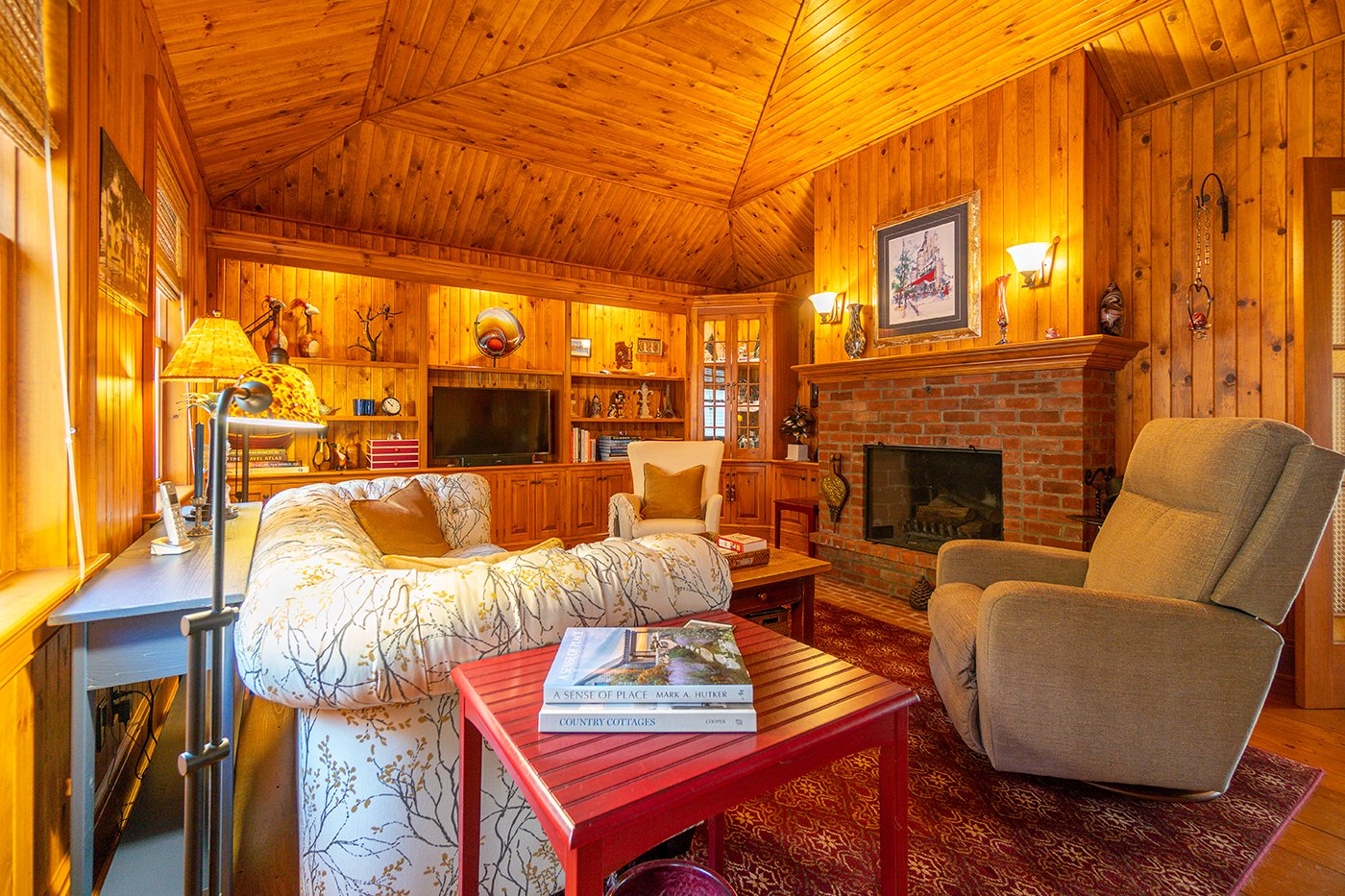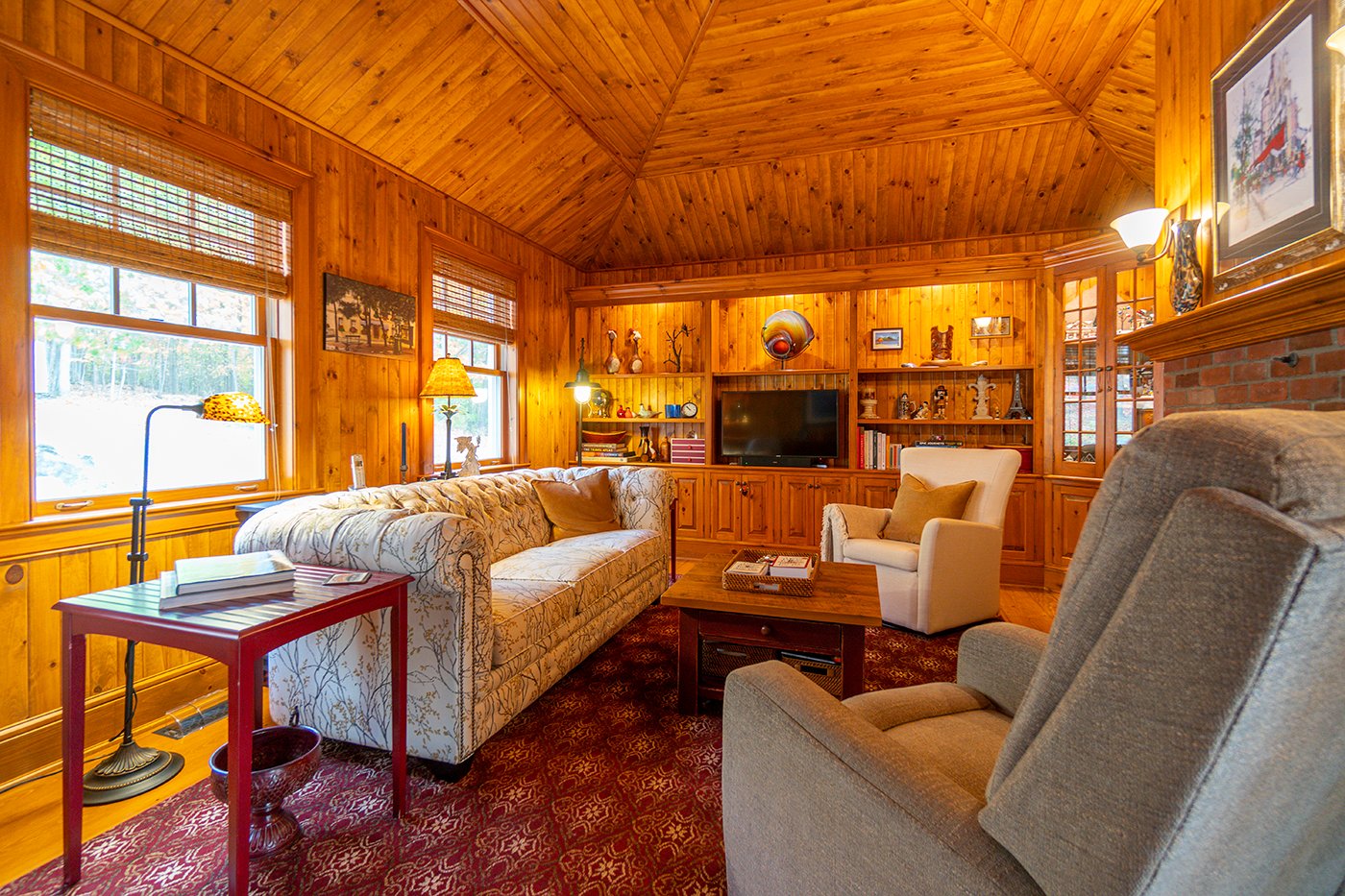 L'omniprésence du bois dans le salon rehausse l'ambiance chaleureuse de la pièce, qui est aussi dotée d'un foyer au bois et de portes françaises vitrées.