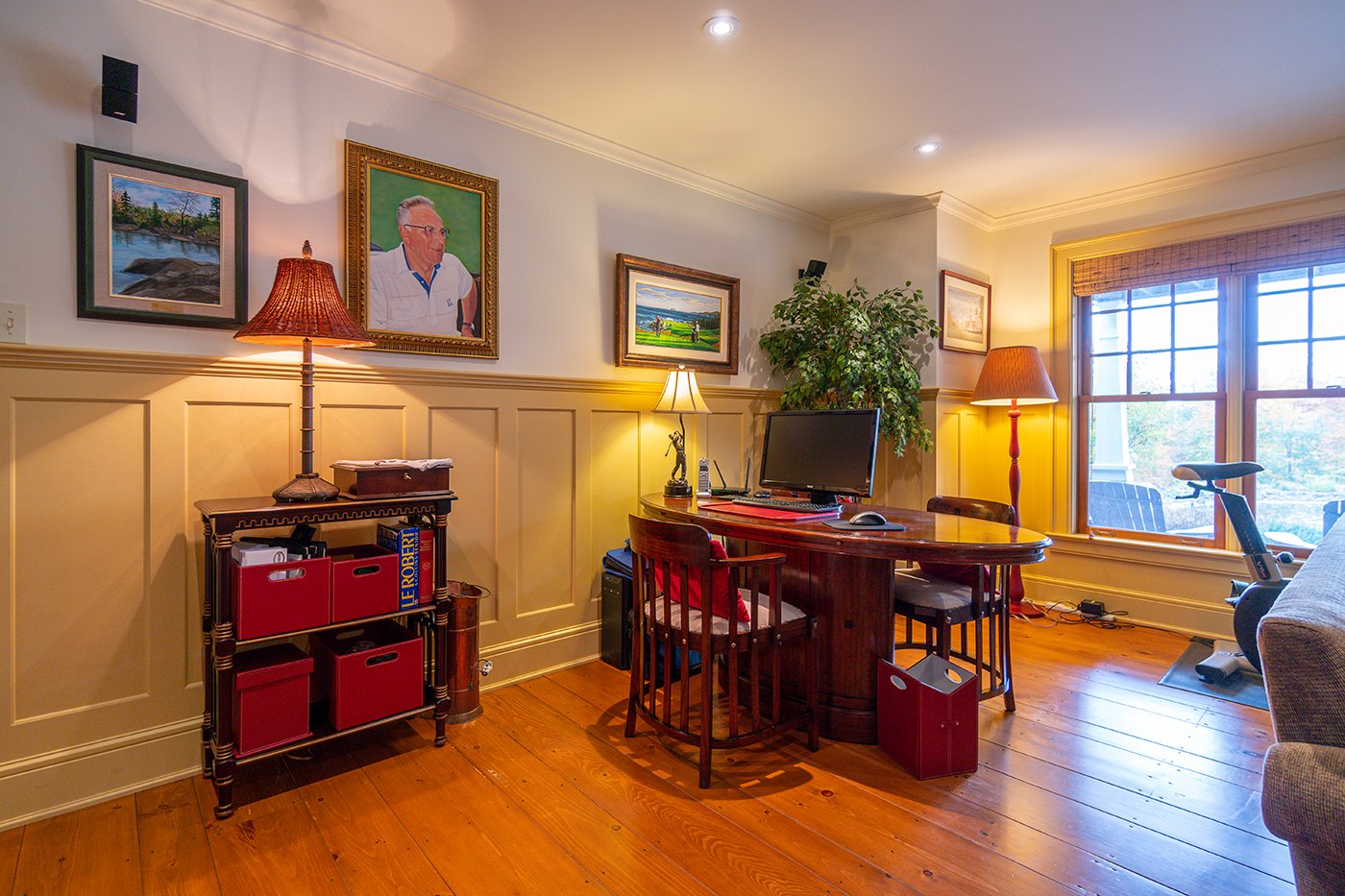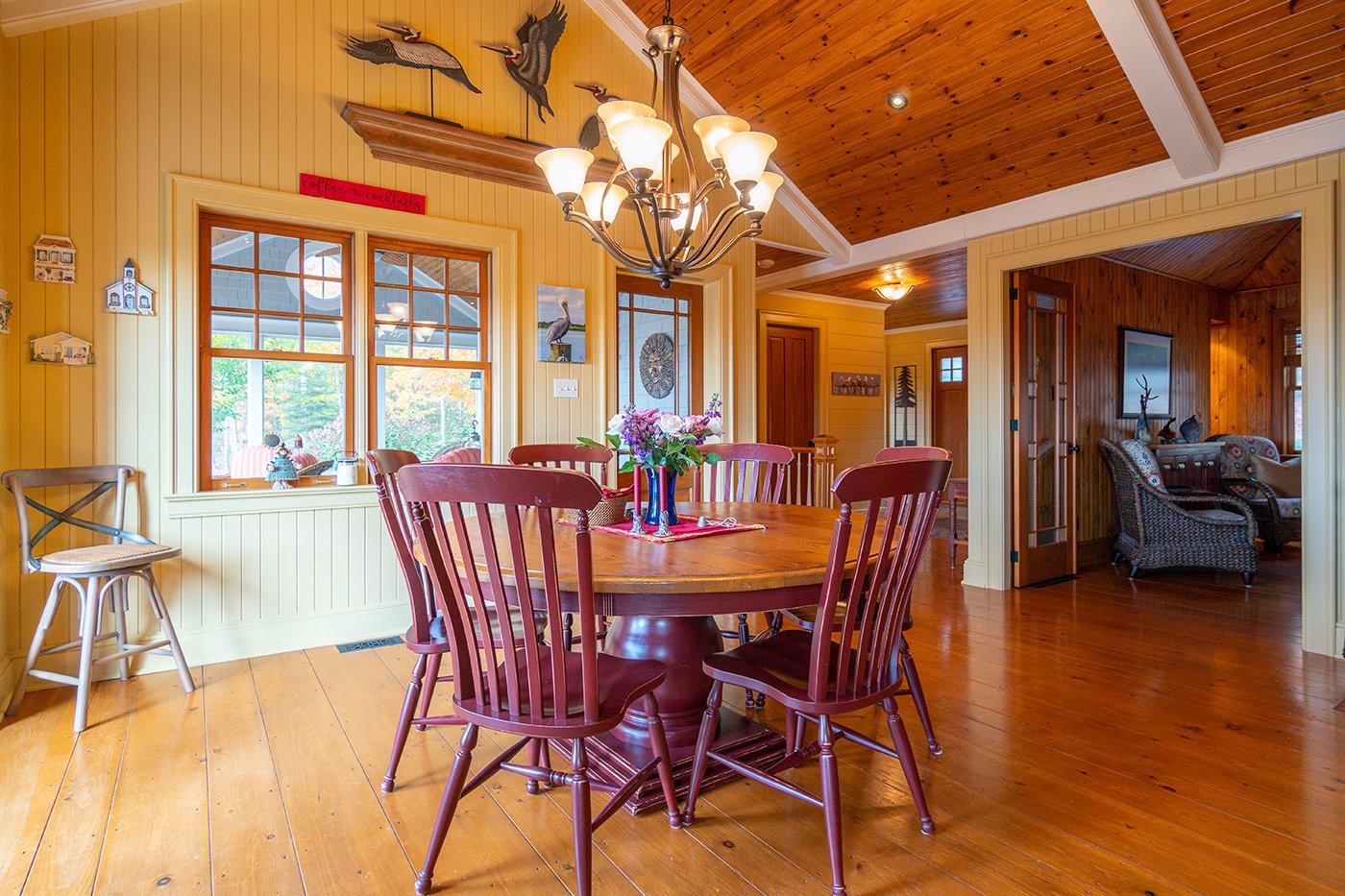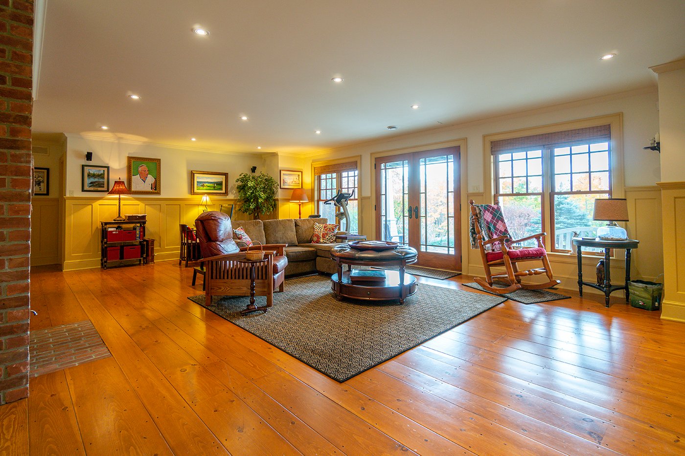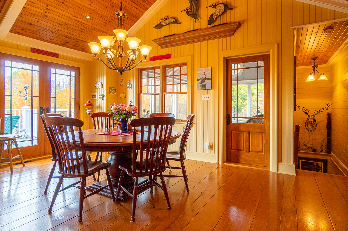 L'omniprésence du bois dans le salon rehausse l'ambiance chaleureuse de la pièce, qui est aussi dotée d'un foyer au bois et de portes françaises vitrées.