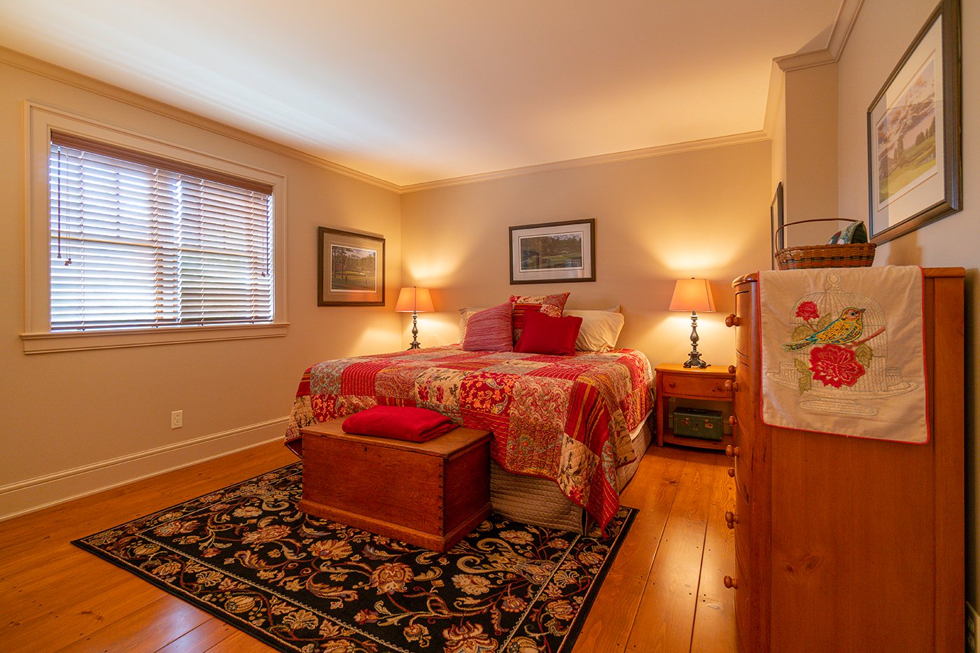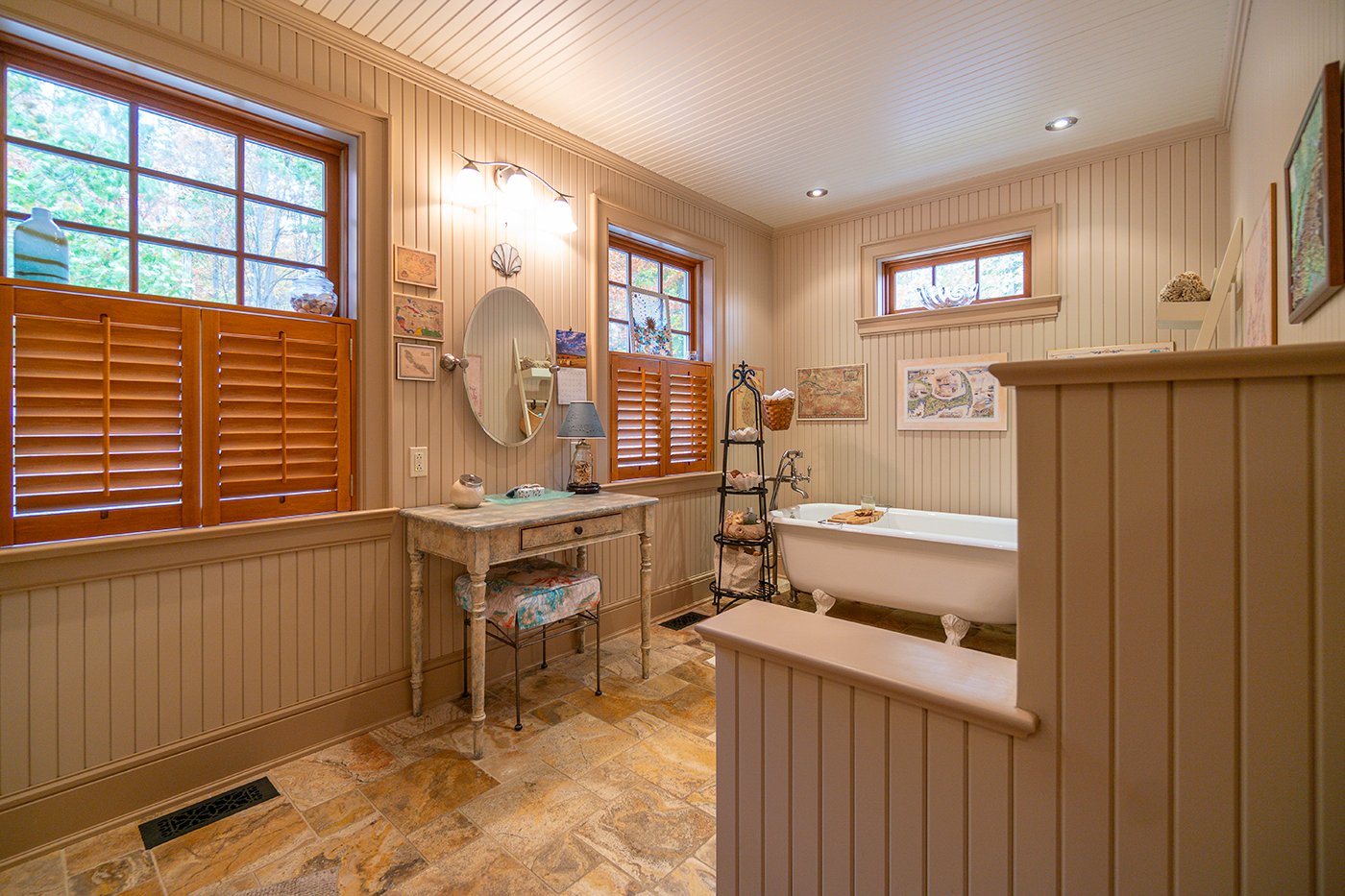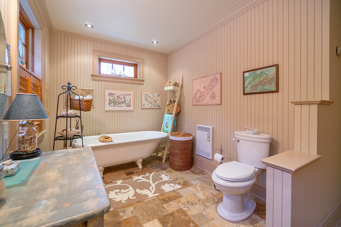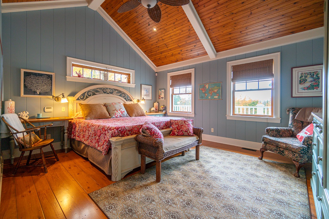 La chambre à coucher principale, avec son plafond cathédral de bois avec moulures et O'gee, compte une garde-robe walk-in et une salle de bains attenante où on retrouve une douche de verre et céramique en coin et un invitant bain sur pieds.