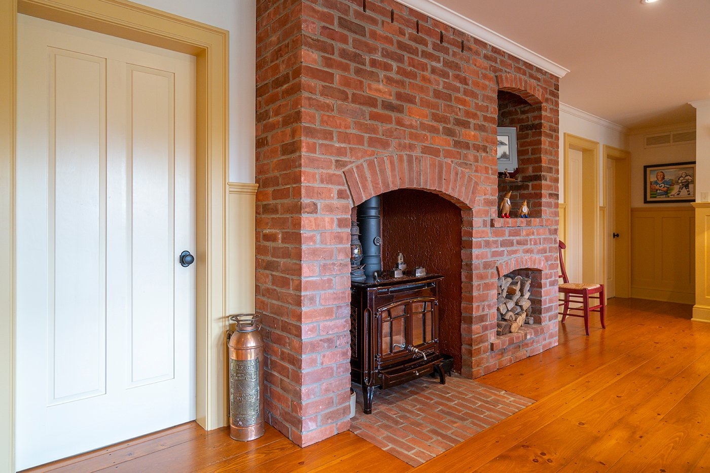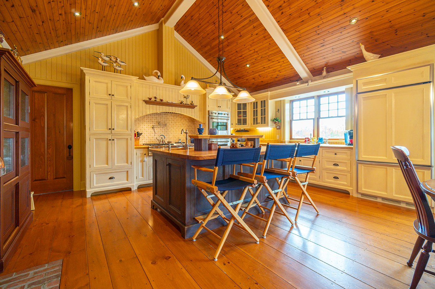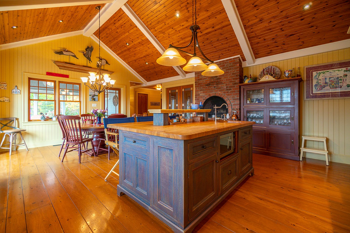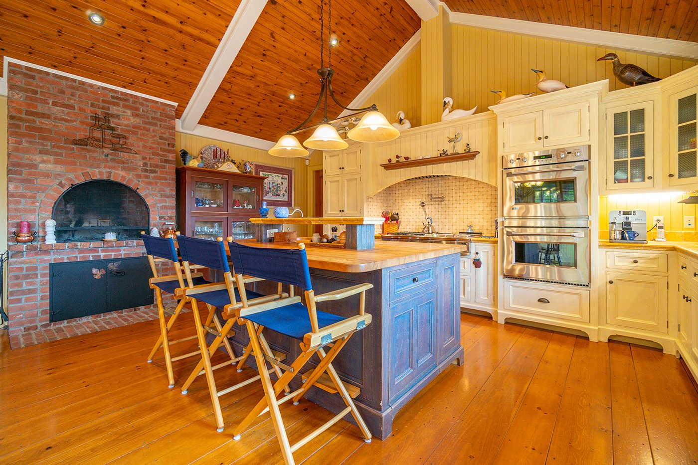 Dans la cuisine, des armoires de bois, un foyer au contour de briques, un îlot central avec espace déjeuner offrant trois places et un dosseret de céramique, contribuent à créer un décor convivial.