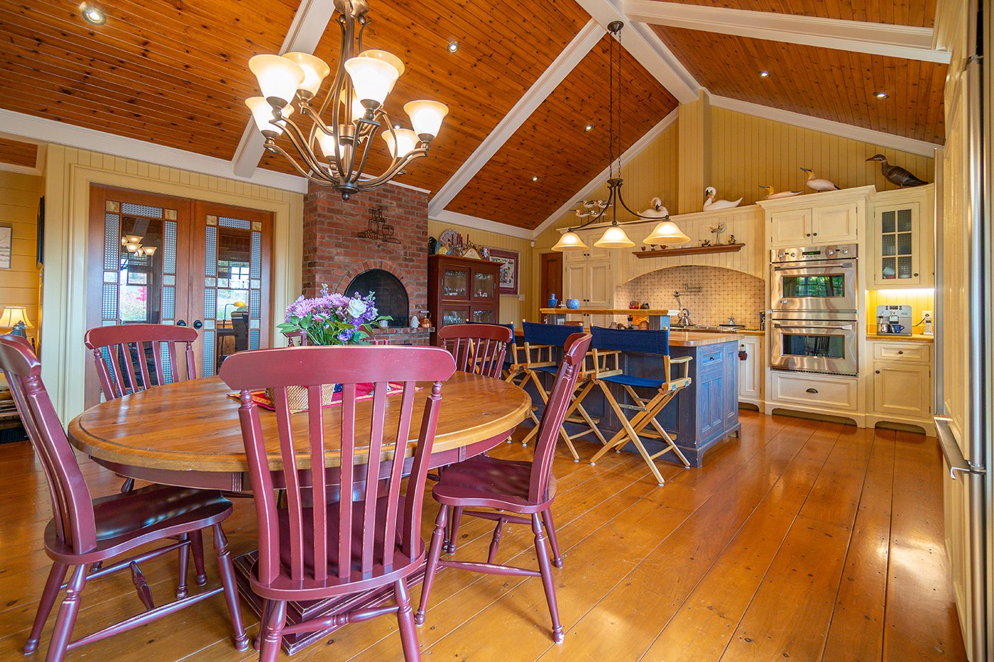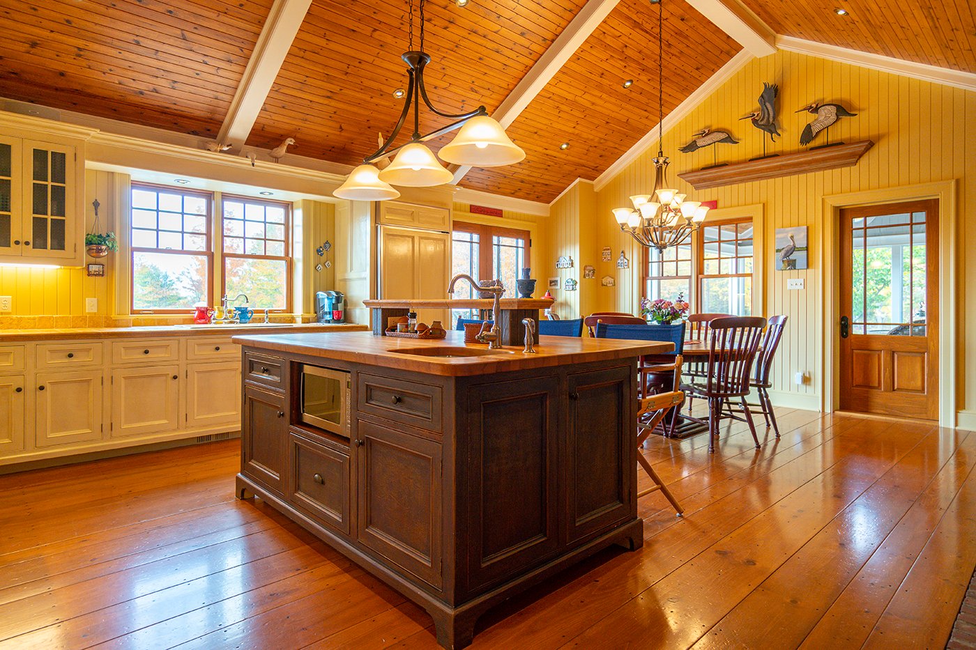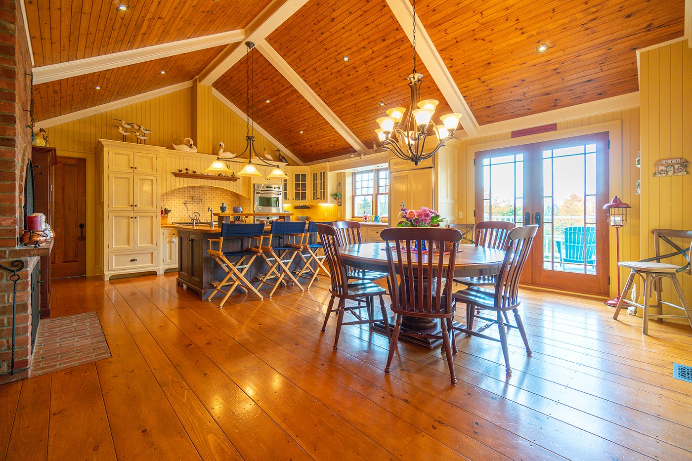 Un impressionnant plafond cathédral de bois de 12,10 pi irr. de haut avec lumières encastrées et poutres apparentes apporte un effet grandiose à l'aire commune regroupant la cuisine et la salle à manger.