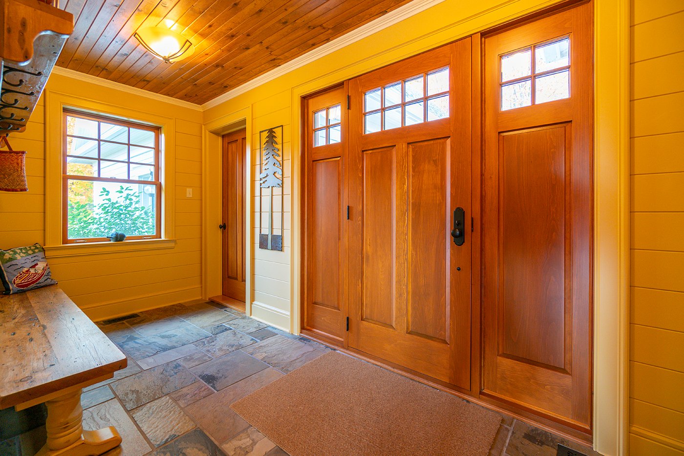 Sur plancher d'ardoise, le hall d'entrée compte une vaste garde-robe double aux portes de bois et un accès au garage.