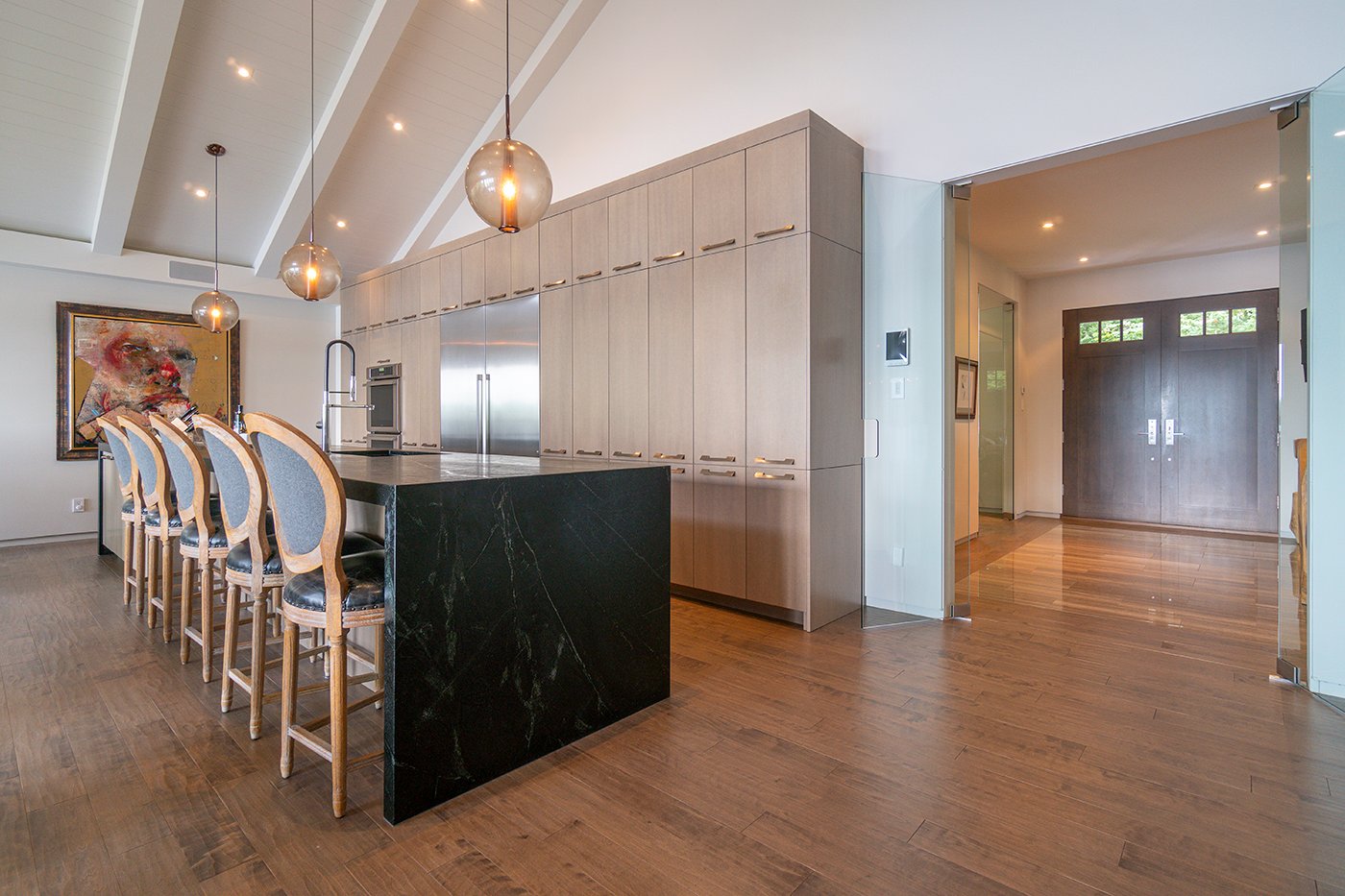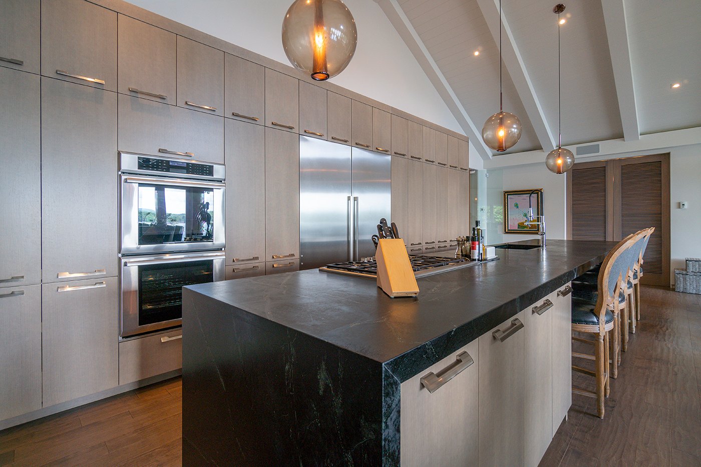 Lumineuse et bien pensée, la cuisine offre un îlot/espace-lunch spacieux en pierres à savon et un mur d'appareils électroménagers haut de gamme encastrés (marque Thermador).