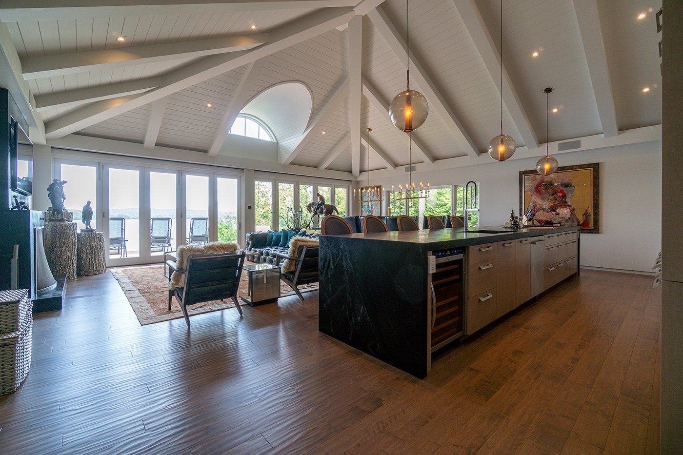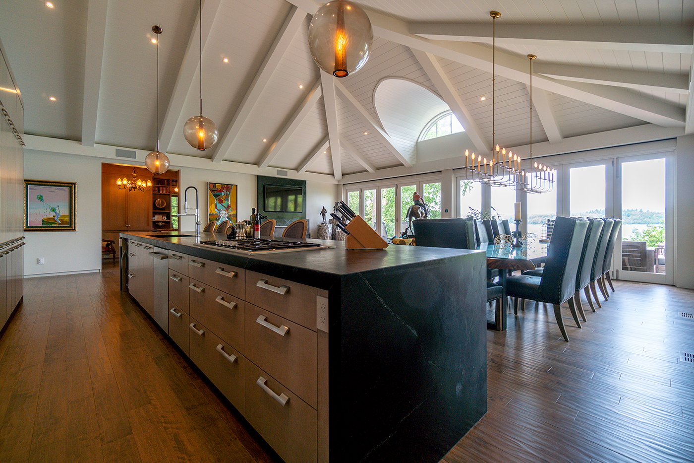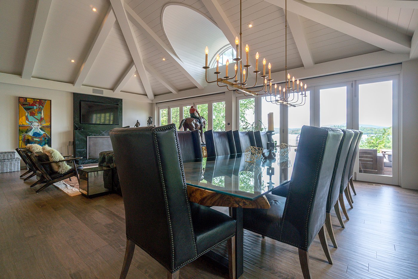 Offrant une vue imprenable sur le lac grâce à l'abondante fenestration caractérisant l'aire commune, le salon et la salle à manger sont à aire ouverte.