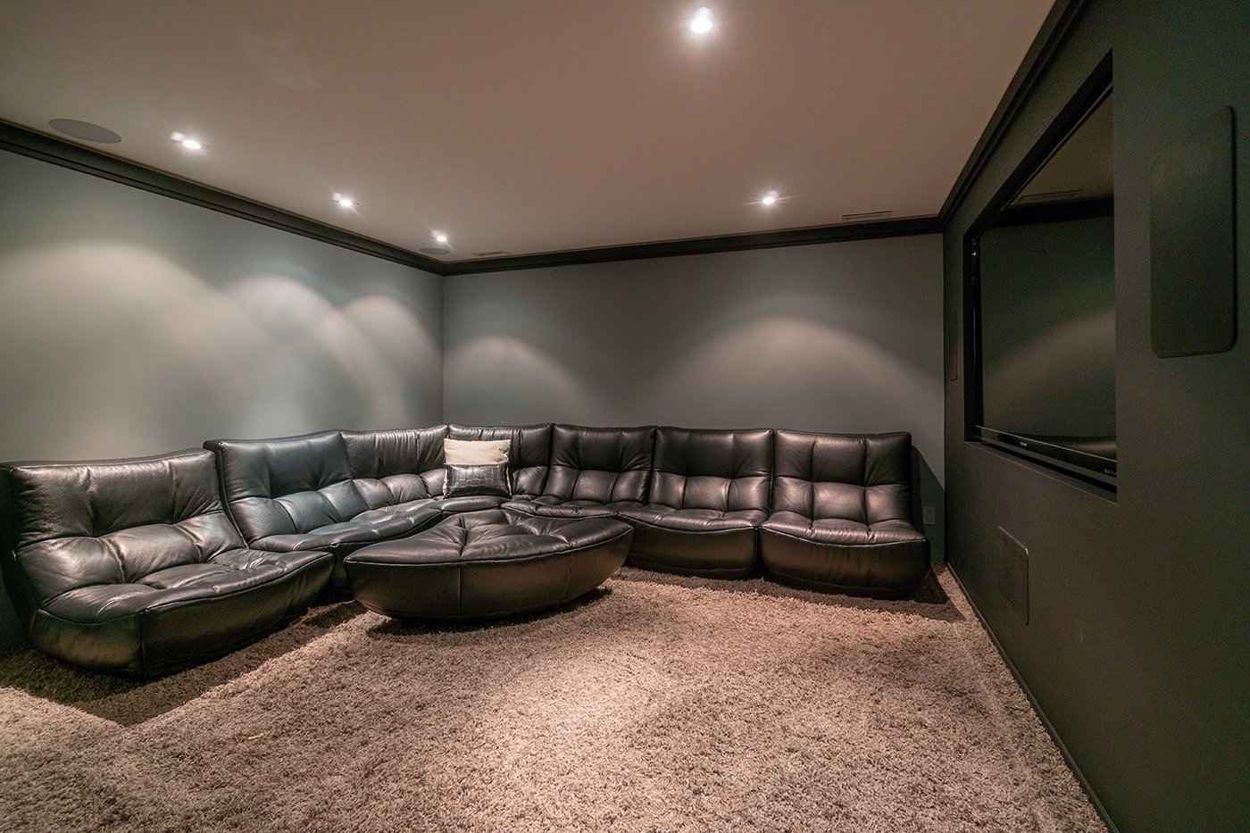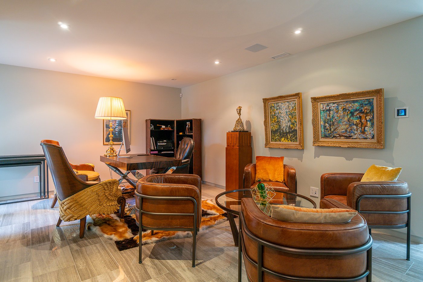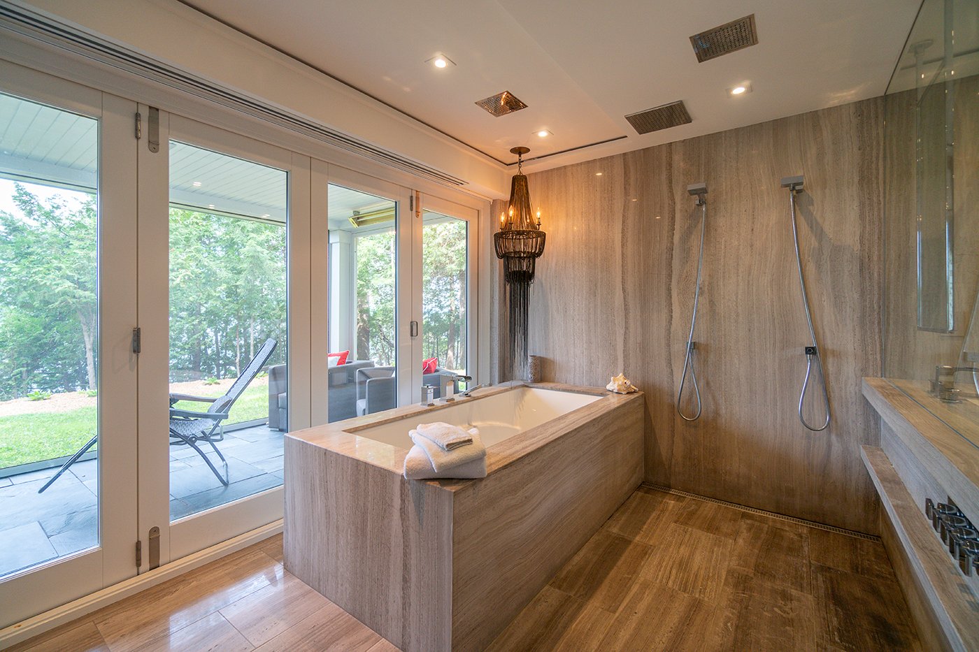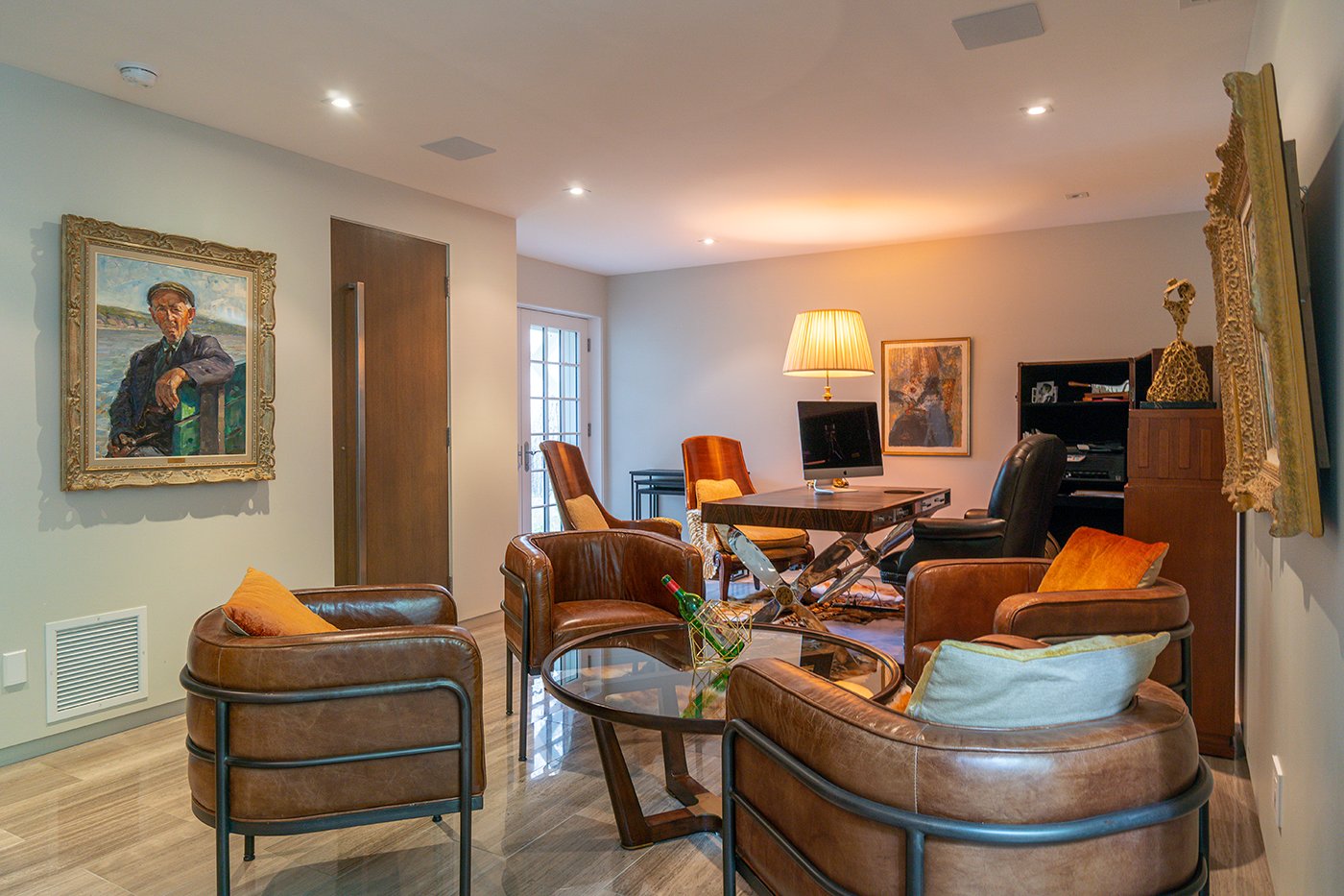 Au sous-sol, on retrouve une salle familiale confortable, une salle de cinéma et une seconde suite avec salle de bains ouverte, regroupant bain à podium de marbre et vanité double, avec accès direct à la cour arrière.