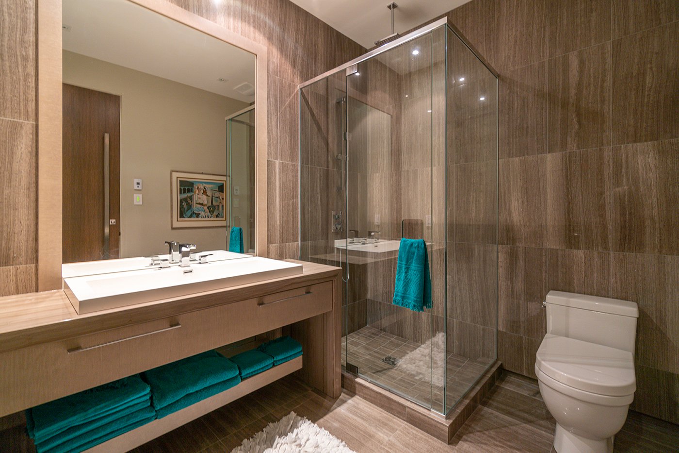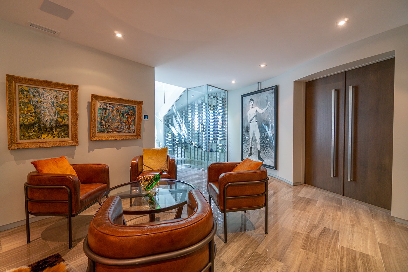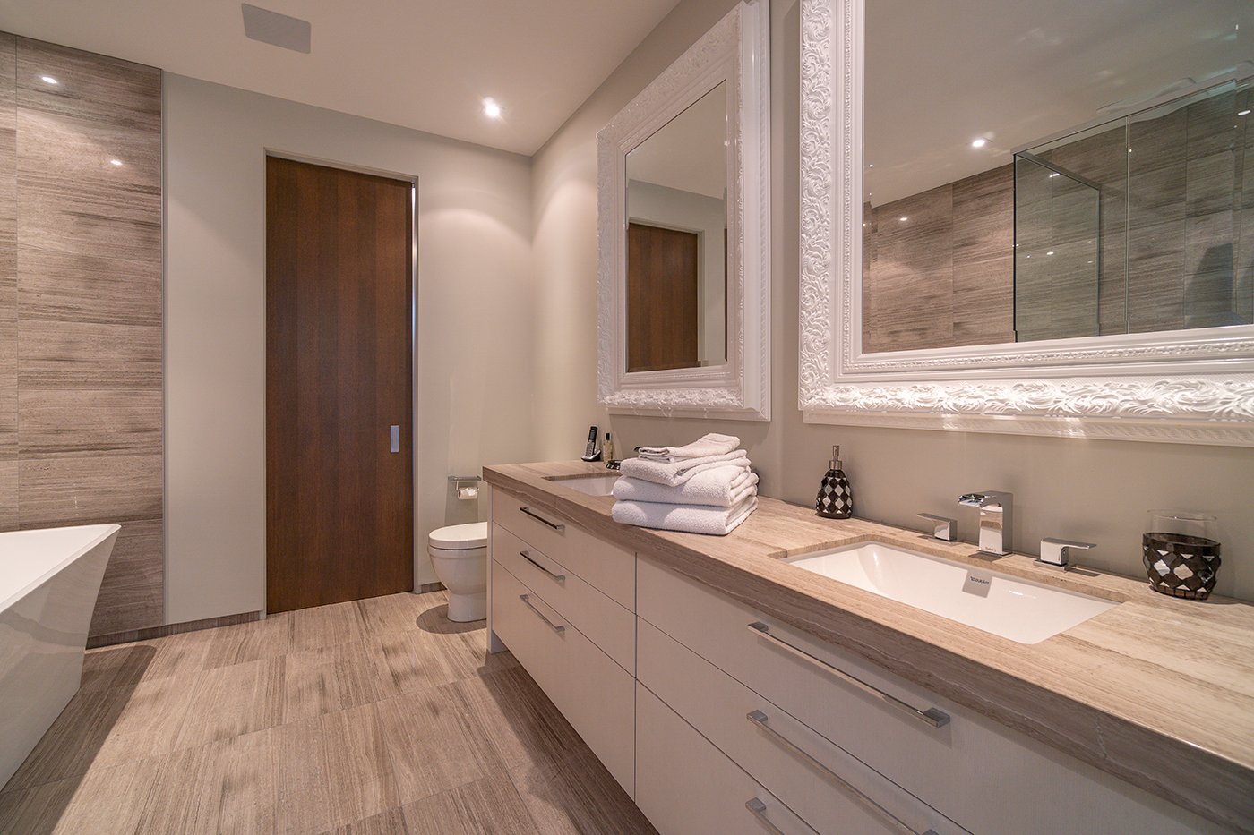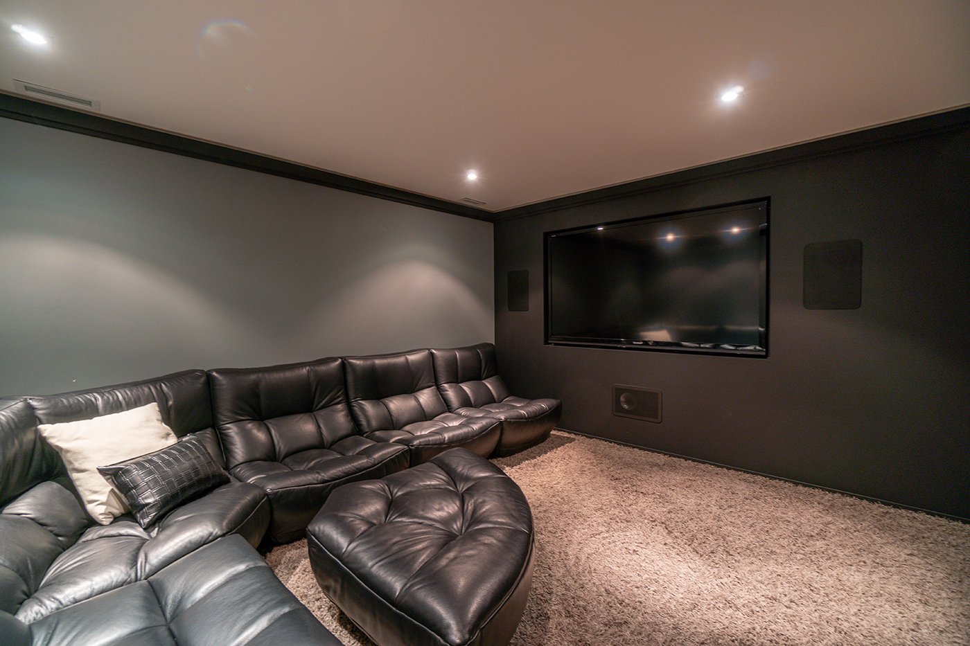 Au sous-sol, on retrouve une salle familiale confortable, une salle de cinéma et une seconde suite avec salle de bains ouverte, regroupant bain à podium de marbre et vanité double, avec accès direct à la cour arrière.