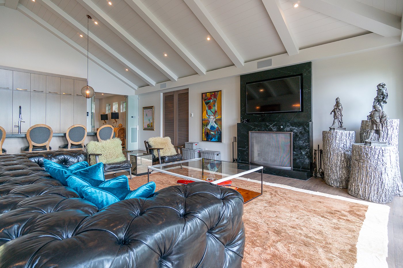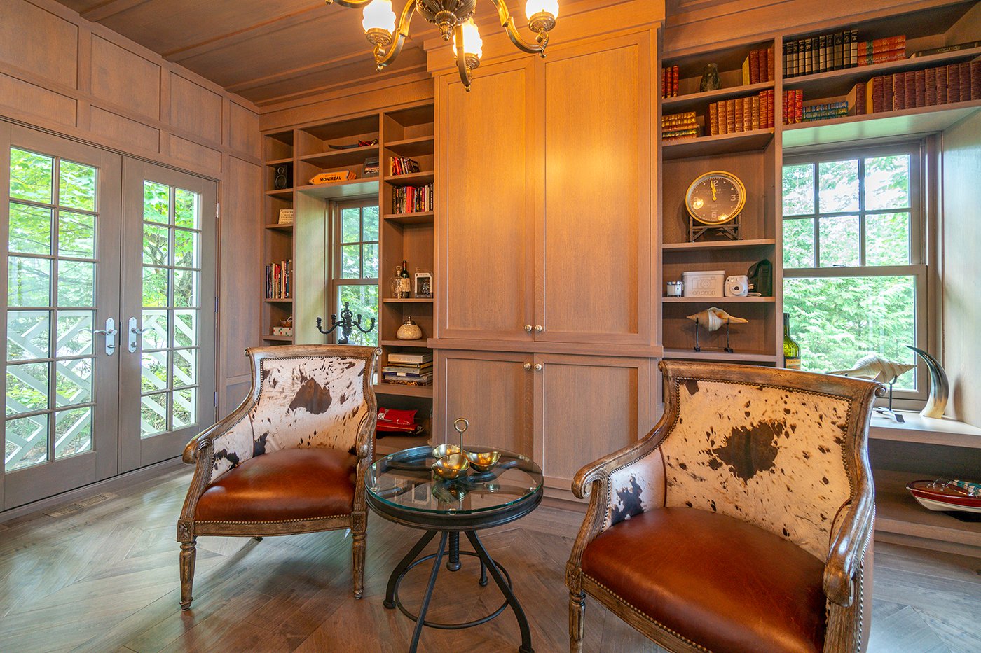 Un majestueux foyer au bois avec contour en pierres à savon occupe le salon et rehaussera à tous coups l'ambiance de vos soirées en famille et entre amis!