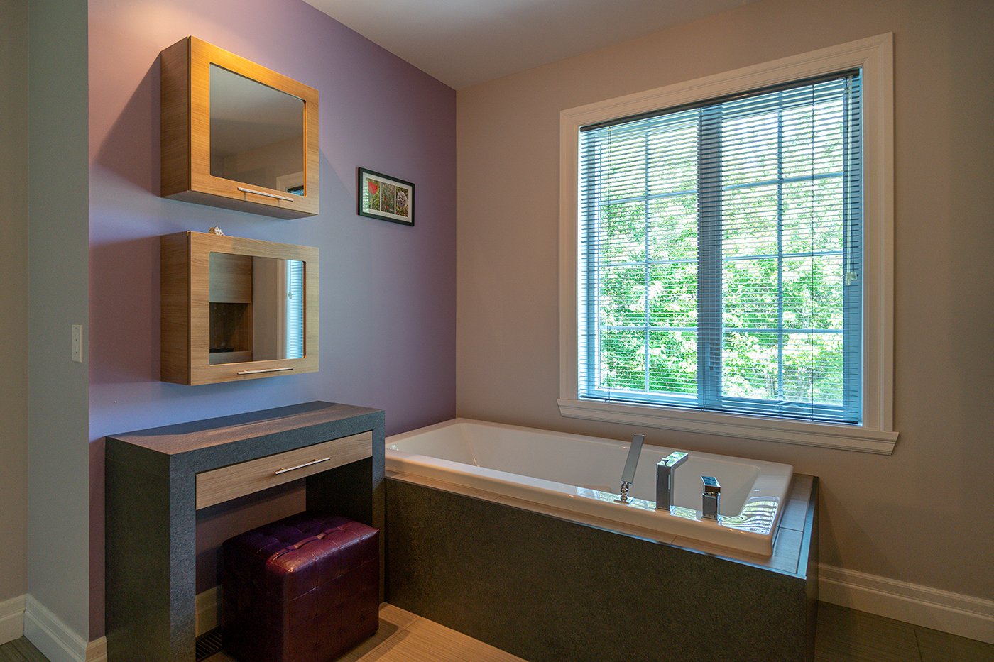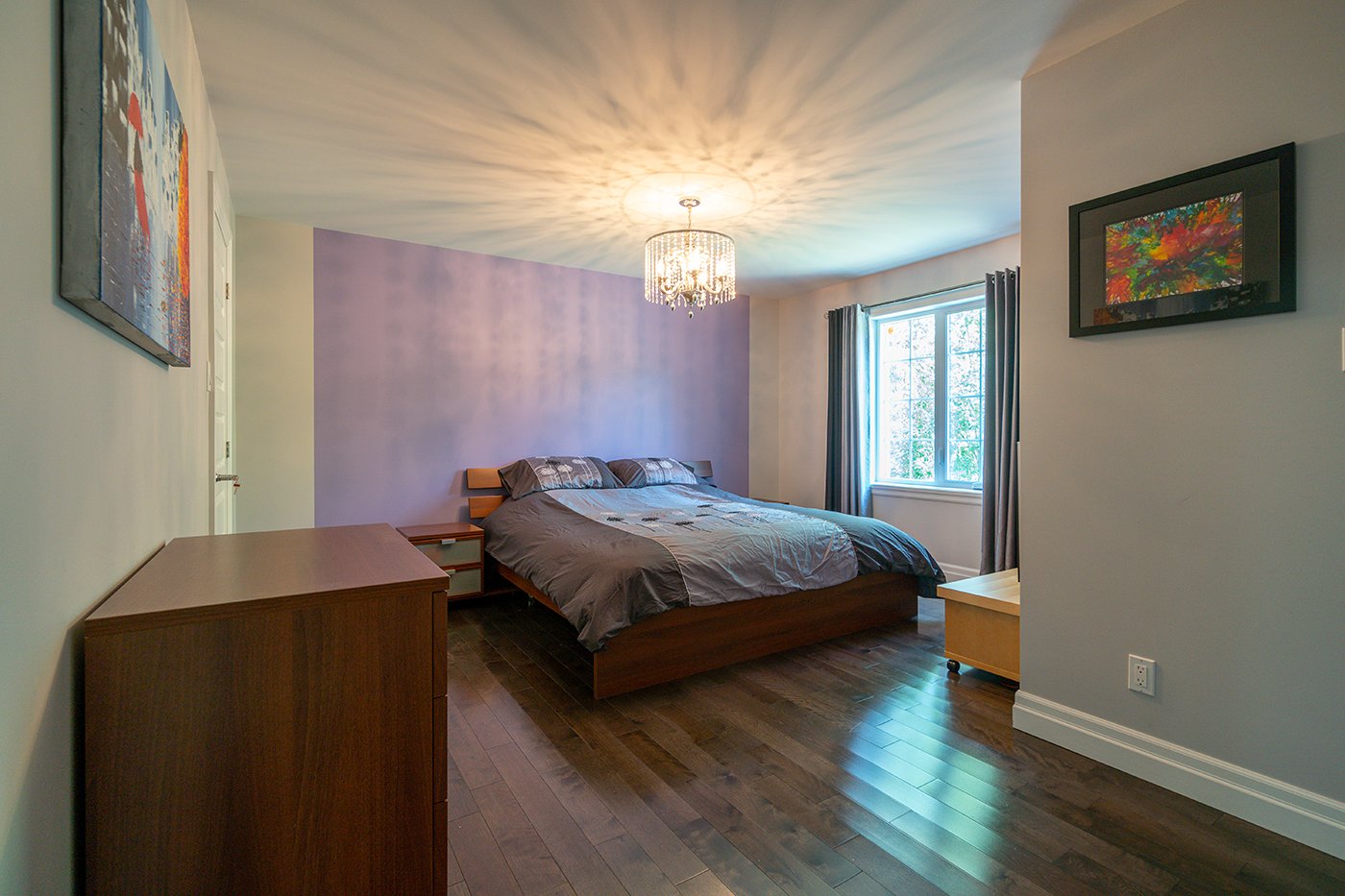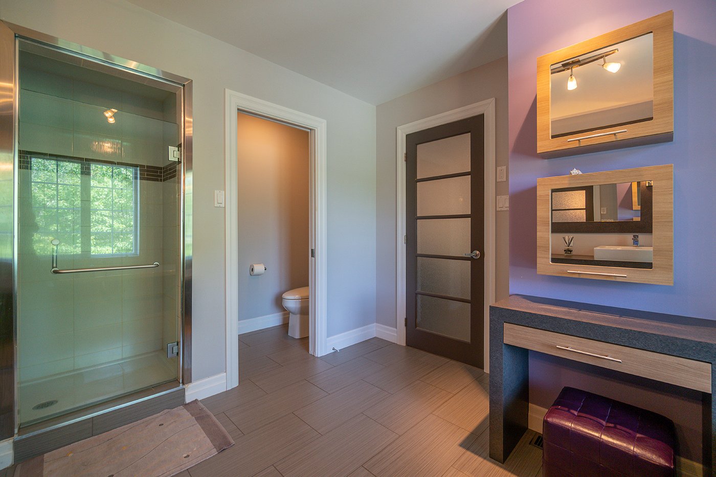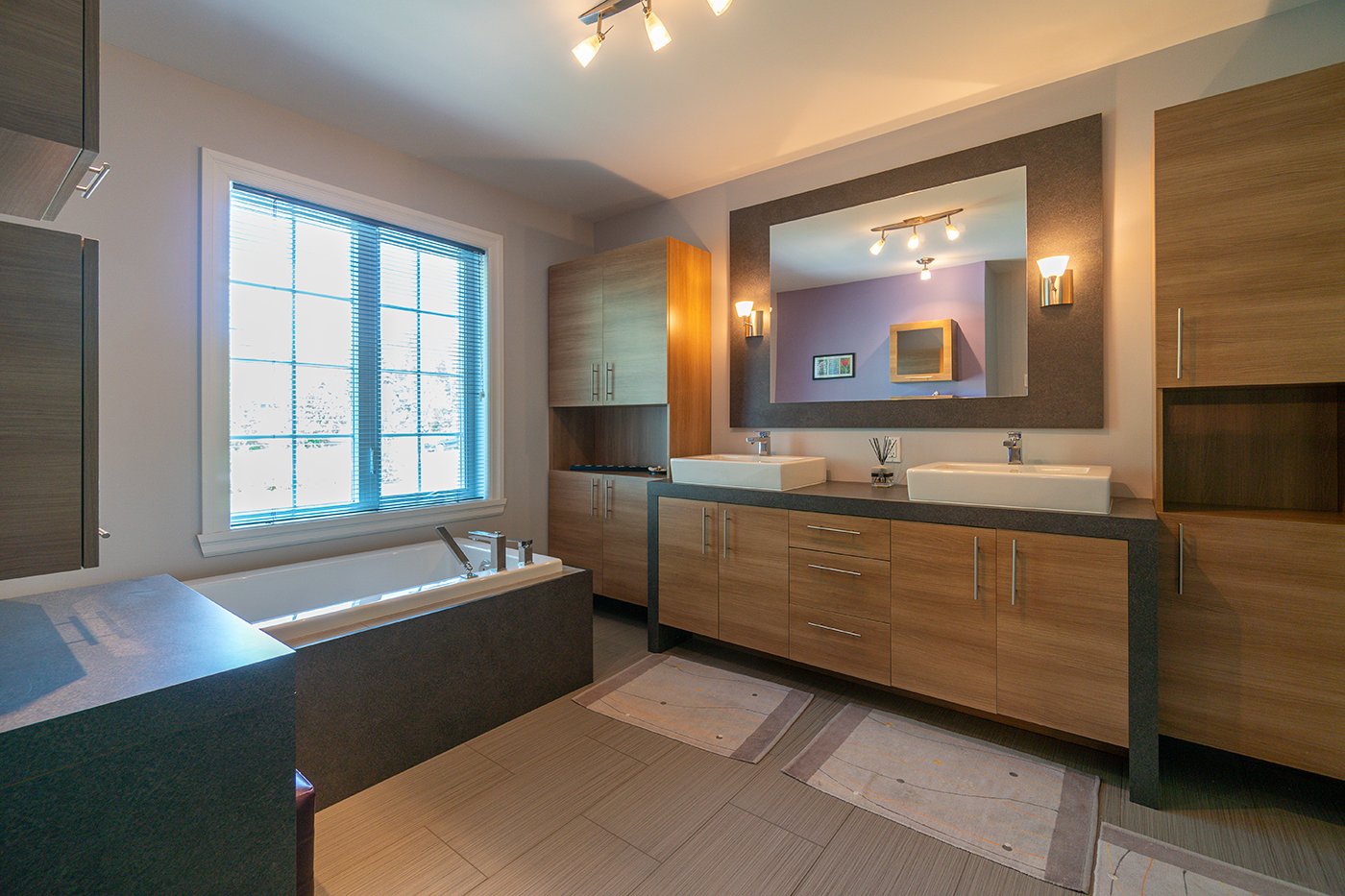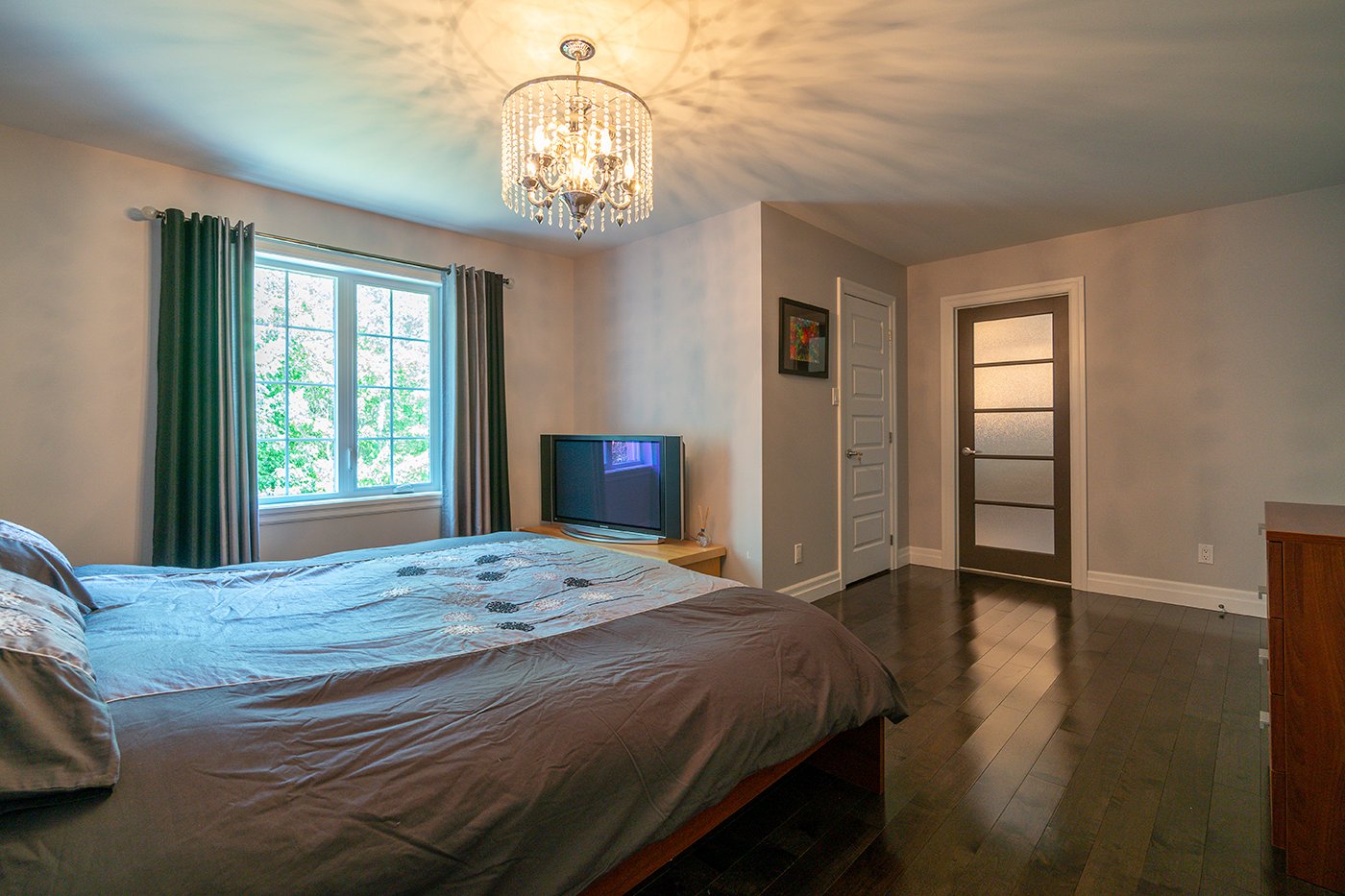 On retrouve 2 garde-robes walk-in dans la chambre principale en plus d'une salle de bains attenante avec douche indépendante de verre et céramique, bain à podium de céramique et double vanité.