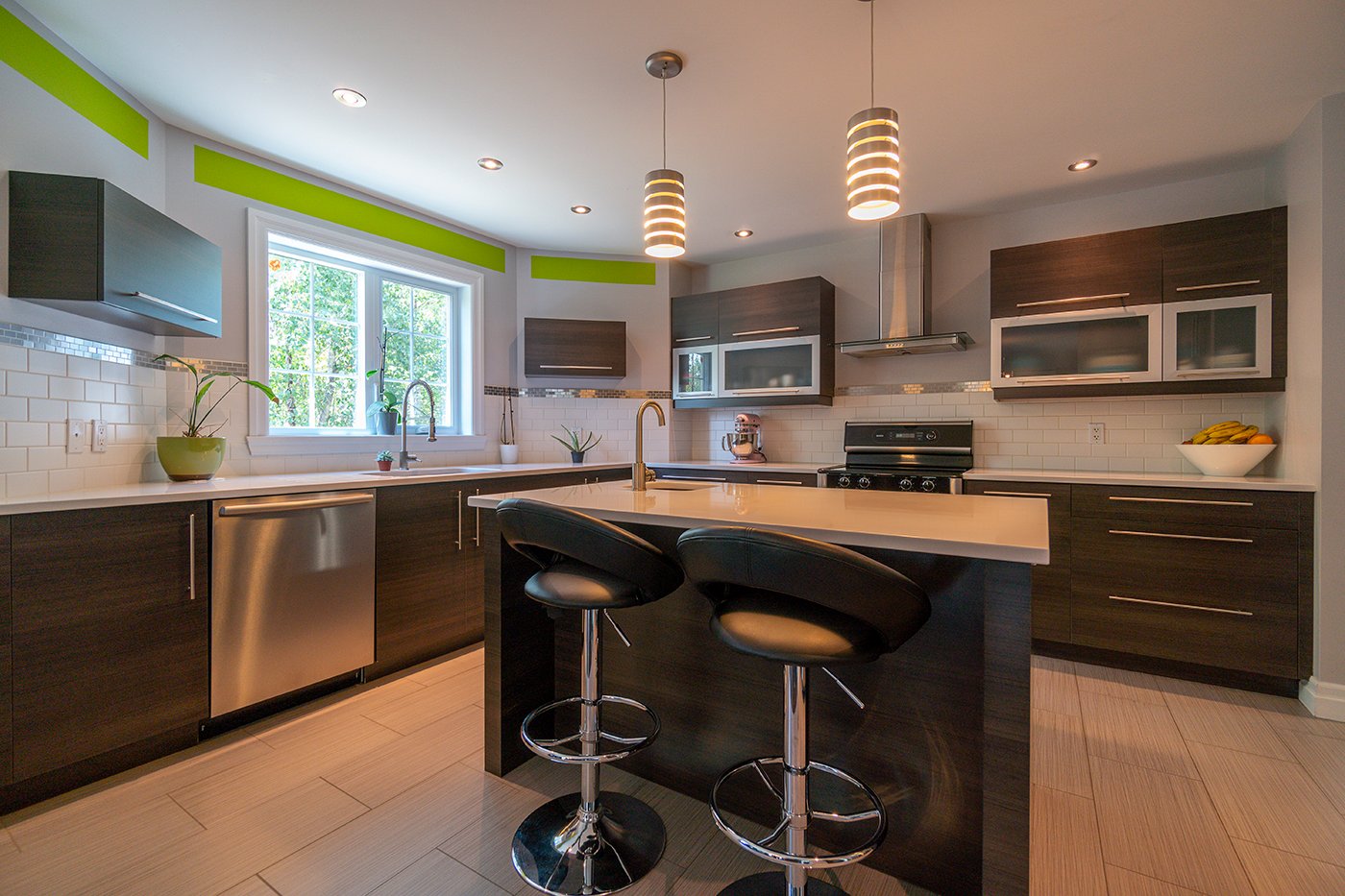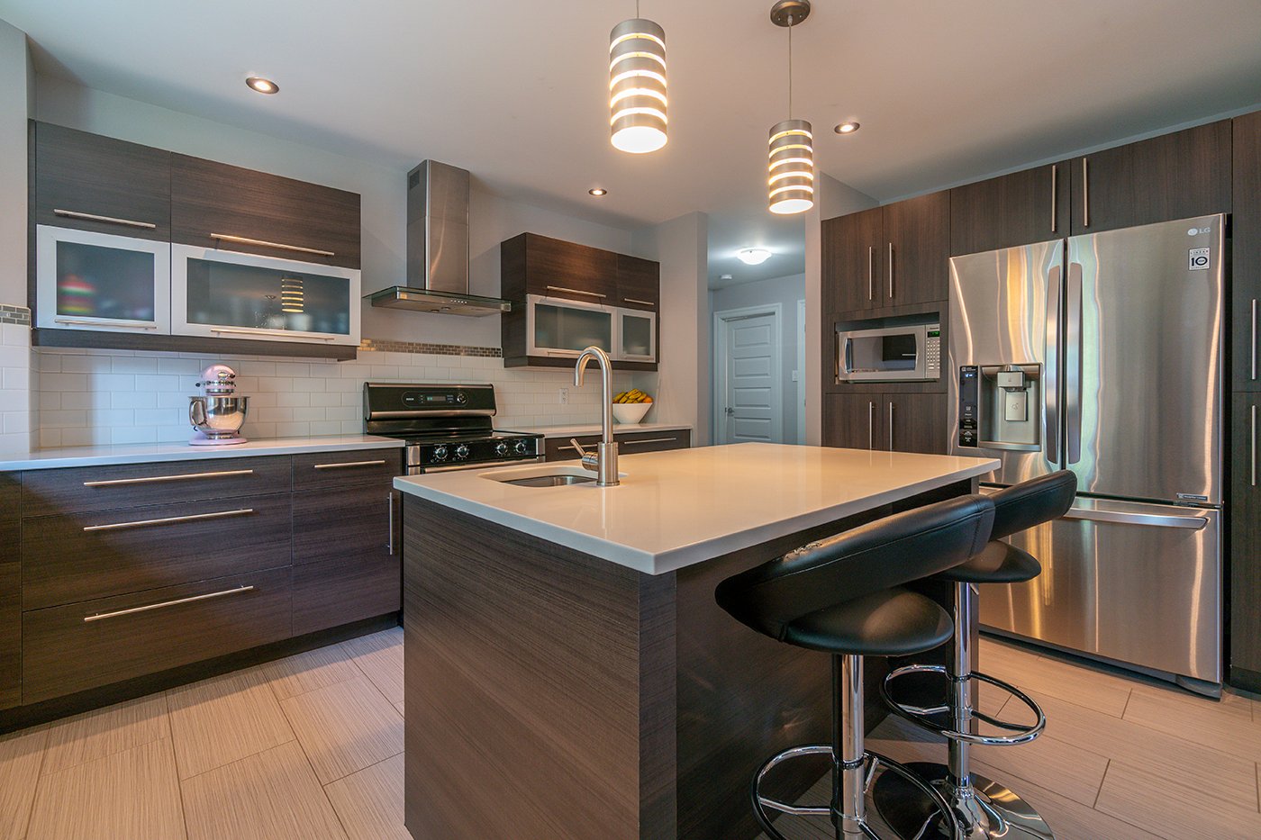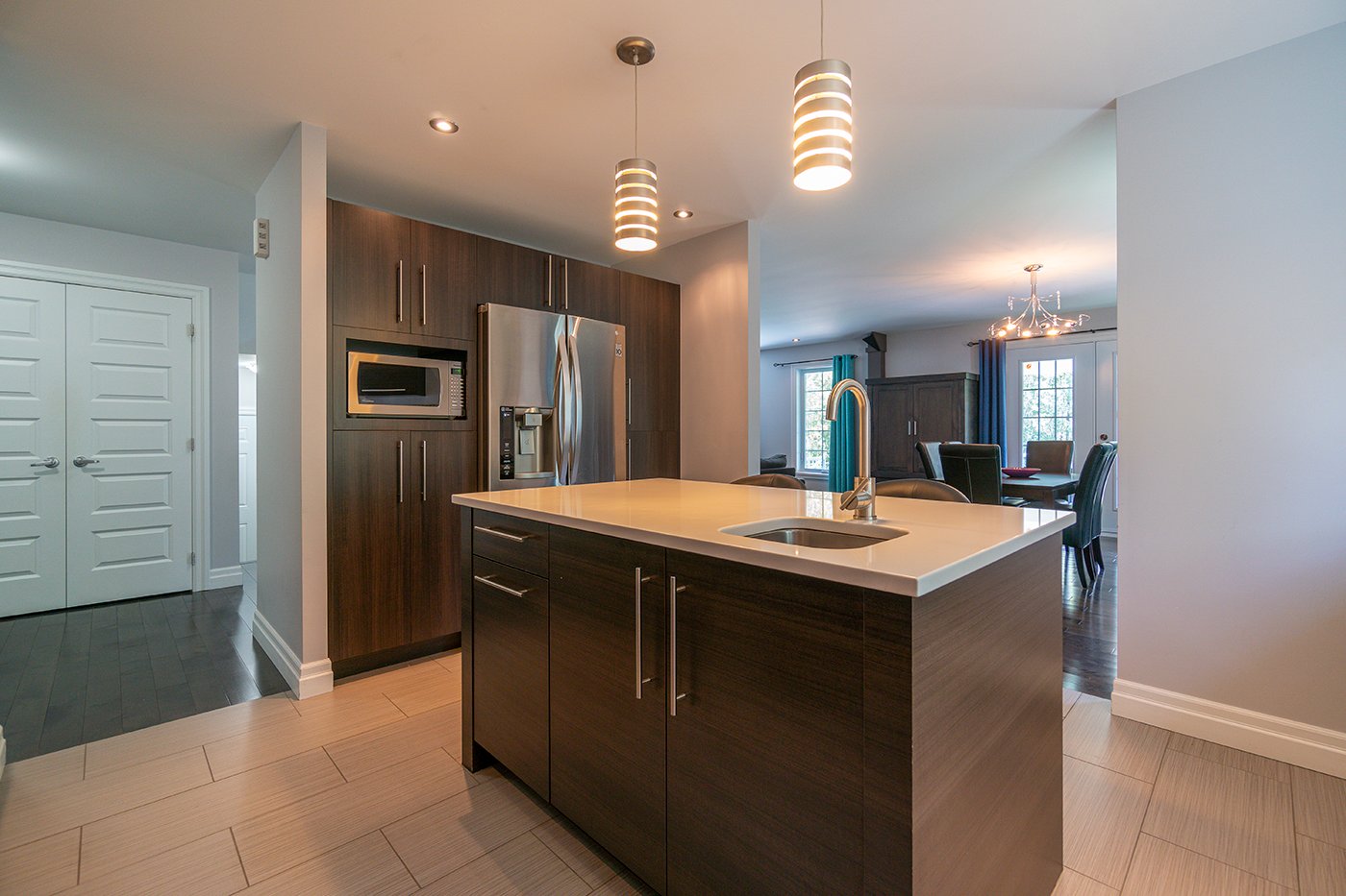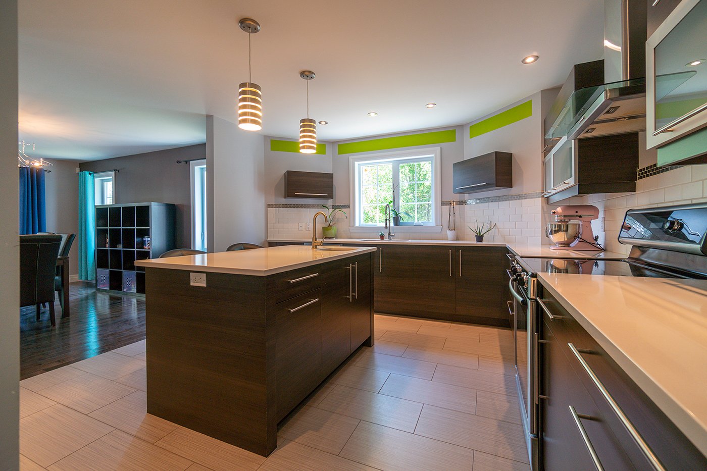 La cuisine est dotée d'un îlot/comptoir-lunch avec évier et d'un dosseret de céramique.
