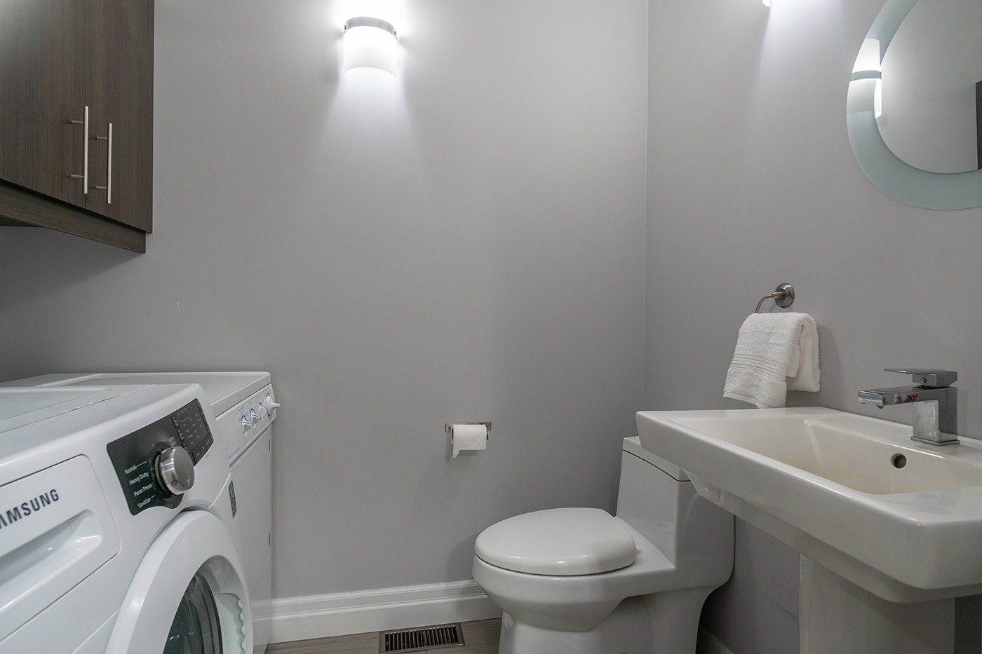 Les installations laveuse et sécheuse se situent dans la salle d'eau du rez-de-chaussée.